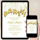 ¡Prepárate para la fiesta! Nuestra invitación de cumpleaños elegante presenta ‘¡FIESTA!’ en texto de globo con lámina dorada fresca, rodeado de confeti dorado. Los detalles de tu fiesta están elegantemente escritos en dorado sobre un fondo blanco crujiente. La parte trasera de la invitación es blanca y presenta confeti adicional. ¡Únete a la celebración!