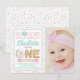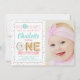 Invitaciones de cumpleaños para niñas con donas glaseadas con acuarela y letras de globo de papel de aluminio dorado en un fondo adorable de sprinkles pastel. Esta invitación de cumpleaños número uno de donut es fácilmente personalizable con tu foto y detalles.