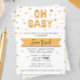 Nuestra invitación de fiesta de bebé con globo de papel de oro Oh Baby es la forma perfecta de invitar a amigos y familiares a tu fiesta de bebé neutral. Esta invitación presenta 'Oh Baby' en globos de papel de oro con puntos de confeti dorados esparcidos alrededor de la frase.