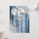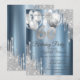 Un diseño moderno, elegante y glamuroso con gotas de purpurina plateada y globos sobre un fondo azul metálico.