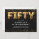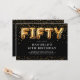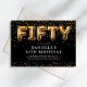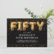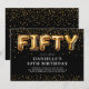Invitación moderna de cumpleaños 50 con un fondo negro elegante, confeti dorado esparcido, globos de helio dorados que deletrean "cincuenta", y una plantilla de texto de fiesta elegante que es fácil de personalizar.