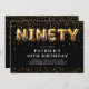 Invitación moderna de cumpleaños 90 con un elegante fondo negro, una dispersión de confeti purpurina de oro, globos de hellio de oro que deletrean "noventa" y una elegante plantilla de texto fiesta que es fácil de personalizar.