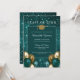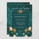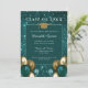 Invitación de graduación con globos de oro verde con brillo. Diseño de fiesta de graduación con cielo estrellado de color azul turquesa y globos de oro con brillo y gorra de graduación con brillo dorado.