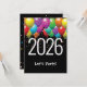 Globos fiestas coloridos y confeti estrella en negro para el fiesta de Año Nuevo 2026. Se puede cambiar el año. Todo el texto es editable.