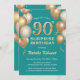 Sorpresa 90 cumpleaños Purpurina Verde azulado y oro Globos Invitación de cumpleaños. Para una mayor personalización, haga clic en el botón "Personalizar" y utilice nuestra herramienta de diseño para modificar esta plantilla.