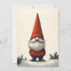 Una encantadora ilustración de un gnomo festivo vestido con un vibrante sombrero y abrigo rojos, de pie en un sereno paisaje nevado. La larga barba blanca del gnomo y su nariz caprichosa asoman bajo el sombrero alto y puntiagudo, evocando un sentido de alegría navideña y folclore nórdico.