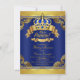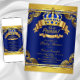 Fancy royal blue and gold crown prince baby shower invitation with elegant royal blue and gold crown and banners on a rich royal blue and gold swirl background. This elegant, fancy, beautiful royal blue and gold prince baby shower invitation is easily customized by simply adding your details in the font style of your choice. This is a printed design with no real diamonds, gold, etc.