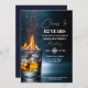 A modern design featuring a gold whiskey glass with burning fire, sparks and ice and elegant calligraphy on a dark blue background. Customize the details for a cool Birthday Celebration.