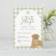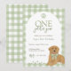 Celebra el primer cumpleaños de tu pequeña con esta invitación de cumpleaños de "Un año dorado". Esta adorable invitación incluye gingham verde, un recuperador dorado con un arco verde y reproducciones de pata. Perfecto para las familias amantes del perro, este dulce diseño le da un toque encantador a cualquier fiesta de cumpleaños.