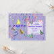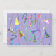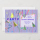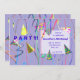 Una invitación de fiesta de cumpleaños con mi diseño de gorras fiestas y serpenteantes con un fondo morado.