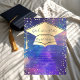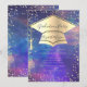 Gorrito de graduación dorado y marco de diamantes sobre un fondo colorido de salpicadura de pintura.