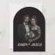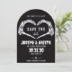 Set a hauntingly romantic tone for your special day with this unique, gothic-inspired Save the Date invitation. Featuring two skeleton hands coming together to form a heart, this arched black-and-white card perfectly captures the "Till death do us part" sentiment.