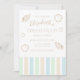 Grad club beach party with cabana stripes in shades of mint green, coastal blue and sandy brown with seashells. Photo template via Pixabay licensed under CC0 and must be replaced with your own photo.