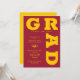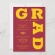 GRAD en curvas amarillas con letras doradas alrededor de los bordes de estas invitaciones rojas para la fiesta de graduación. VEA TODA LA COLECCIÓN de colores prehechos, placas de papel, servilletas y más en nuestra tienda.