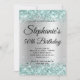 Crea tu propia invitación para la celebración de cumpleaños de hito. Los gráficos decorativos falsos brillantemente blancos y verde azulados purpurinas forman un borde superior e inferior. El arte digital de fondo presenta un brillante gradiente gris claro satinado. Personalizar los colores o estilos de fuente de invitación. Los lujosos destellos, brillo y purpurina se crearán con elementos artísticos que se imprimirán como una foto. Fabulosa invitación de cumpleaños número 50 para tu mejor amigo.