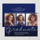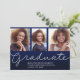 Invitación a una fiesta de graduación con un elegante tipo de letra y tus 3 fotos en un oscuro fondo azul marino. La parte posterior es azul marino con texto blanco, pero completamente personalizable con la herramienta de diseño de Zazzle.