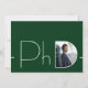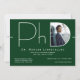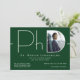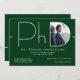 Una moderna invitación para una fiesta de graduación de doctorado con fondo verde y letras blancas. Celebra que estés hecho con esta elegante invitación. Simplemente agrega tu foto e información, agrega esta invitación a tu carrito, y celebra este gran logro. Diseño de vacaciones de posgrado PhD con foto blanca verde moderna | ©Melissa Patton - Diseñador