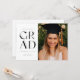 Celebra tu graduación con estilo con esta moderna invitación de graduación e invitación. Presenta la palabra GRAD en elegantes sans serif en el frente, junto con un espacio para una foto. La parte trasera de la invitación tiene espacio para una segunda foto así como para todos los detalles de tu fiesta de graduación.