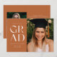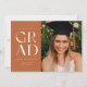 Celebra tu graduación con estilo con esta moderna invitación de graduación e invitación. Presenta la palabra GRAD en elegantes sans serif sobre un fondo de terracota colorido en el frente, junto con un espacio para una foto. La parte trasera de la invitación tiene espacio para una segunda foto así como para todos los detalles de tu fiesta de graduación.