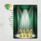 Texto Gold 2025 en el foco de atención con cortina de escenario verde para la invitación a la fiesta de graduación 2024.