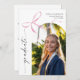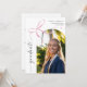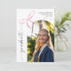 Celebra tu logro académico con nuestra invitación a graduación de Bow Rosado, diseñada para combinar elegancia y estilo moderno, capturando perfectamente la esencia de tu día especial. El delicado y suave arco de color rosa de las acuarelas adorna ambos lados de la invitación, añadiendo un toque de sofisticación y encanto, creando un marco elegante para tus detalles de graduación. Con una plantilla de fotos en forma de arco en la parte delantera, puedes añadir una imagen muy apreciada que refleja tu viaje, transformando la invitación en un recuerdo memorable. La palabra "graduado" se presenta bellamente en un moderno guión vertical en el frente, mientras que "fiesta de grado" grava la parte trasera, ofreciendo una estética contemporánea y elegante. El elegante diseño de esta invitación lo hace adecuado para cualquier celebración de graduación, ya sea una ceremonia formal o una reunión informal con amigos y familia. Invite a sus seres queridos a unirse a la celebración de este importante hito con nuestra invitación a graduar a Bow Rosado. Es más que sólo una invitación; es una hermosa expresión de tu éxito y el emocionante nuevo capítulo que espera.