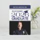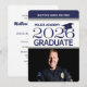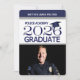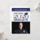El gorro de graduación y el tassel están en azul marino para coordinar el estilo azul y blanco de esta invitación fotográfica, específicamente para mostrar al nuevo graduado de la academia de policía.