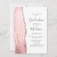 Esta moderna invitación a la fiesta de graduación de 2025 muestra una imagen acuarela de un ágate geodésico en tonos rosa rubor con falsos toques de purpurina dorado. La palabra "Graduación" y el primer nombre del graduado aparecen en un elegante guión de escritura a mano gris carbón vegetal sobre fondo blanco, junto con detalles fiestas en sans serif y cursiva. El dorso de la tarjeta es blanco sólido.