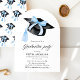 Celebra tu graduación con esta elegante y moderna invitación en forma de arco, con un arco azul moda, una tapa de graduación clásica y una tipografía elegante. Perfecto para una celebración de graduación moderna y sofisticada, esta plantilla editable es fácil de personalizar para imprimir o compartir digital. Una manera atemporal y elegante de invitar a los huéspedes a su hito especial! 💙 🥂
