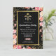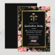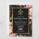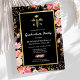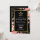 Invitaciones de graduación de enfermería elegantes con un fondo negro de moda, flores de acuarela rosadas lindas, brillo dorado brillante, el símbolo médico caduceo y una plantilla de fiesta de graduación que es fácil de personalizar.