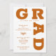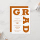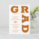 GRAD en negritas curvas de letras naranjas quemadas alrededor de los bordes de estas invitaciones blancas a la fiesta de graduación. VEA TODA LA COLECCIÓN de colores prehechos, placas de papel, servilletas y más en nuestra tienda.