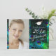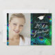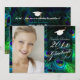 Invitaciones de graduación o de fiesta de graduación con marco de foto y graduado con gorra sobre fondo de pluma de pavo real... esto es fácil de personalizar. Fuentes y color de fuentes DIY también.
