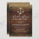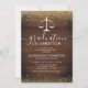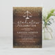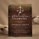 Invitaciones a la fiesta de graduación de una escuela de derecho rústico con un fondo rústico de madera, un falso purpurina de oro, la báscula de la justicia y una plantilla moderna de celebración que es fácil de personalizar.