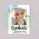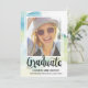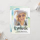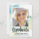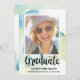 Esta invitación de graduación de fotos de moda muestra la palabra "Graduado" escrita en bella caligrafía, un sutil fondo azul y verde de color de agua, y una foto enmarcada del nuevo graduado. Los detalles del fiesta de calificaciones se pueden agregar al dorso de la tarjeta.