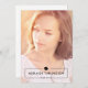 Esta sencilla y moderna invitación a la fiesta de graduación de fotos incluye una elegante placa con el nombre y el tapón de graduación que superponen una plantilla de foto vertical de sangre completa. Los detalles del fiesta de grado se encuentran en la parte posterior de la tarjeta.