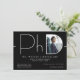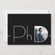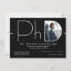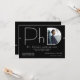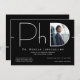 Una moderna invitación para una fiesta de graduación de doctorado con fondo negro y letras blancas. Celebra que estés hecho con esta elegante invitación. Simplemente agrega tu foto e información, agrega esta invitación a tu carrito, y celebra este gran logro. Diseño de vacaciones de posgrado PhD con foto moderna en blanco negro | ©Melissa Patton - Diseñador