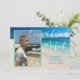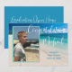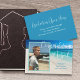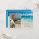 Anuncio de graduación con foto y texto personalizado. Agrega una foto vertical en la parte delantera sobre una imagen de fondo de playa tropical. Gran texto en script blanco "Felicidades Nombre". Agrega más texto para el nombre de la escuela y clase del año. En la parte trasera, personaliza para una celebración con texto blanco sobre color azul mar. Cambia y elimina texto según sea necesario.
