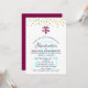Una invitación para una celebración de graduación de enfermería. Diseñada con puntos de confeti dorado falso en la parte superior. Un símbolo de caduceo rojo violáceo con las letras R N a ambos lados. Un estetoscopio azul pastel detrás del texto de la fiesta.