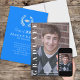 Este diseño presenta un premio de graduación, una foto de primer año de la graduación, un emblema clásico tradicional de hojas de laurel, un gorra de tabla de mortero de tapa de graduación, un simple mortero minimalista mínimo, un nombre personalizado de color de la escuela, con la clase de tipografía de caligrafía, una invitación de graduación elegante, invitaciones a fiestas de graduación de grado, una tarjeta fotográfica azul azul azulado