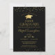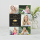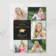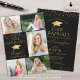 Elegante invitación a fiesta de graduación en negro y dorado (u otro color de fondo) con un collage de 5 fotos en la parte frontal (y 1 en la parte trasera), un gorro de graduación o birrete de falso foil metálico dorado, confeti de estrellas doradas diminutas, un título de tipografía de caligrafía elegante GRADUADO 20XX y letra manuscrita moderna para el nombre de su graduado. El color de fondo negro editable se puede cambiar a un color escolar, color favorito o un color que coordine con sus imágenes. ASISTENCIA: Para obtener ayuda con la modificación del diseño o personalización, cambio de color, transferencia del diseño a otro producto o si desea elementos coordinados, contacte al diseñador ANTES DE REALIZAR EL PEDIDO a través de la pestaña de MENSAJE de Chat de Zazzle o envíe un correo electrónico a makeit