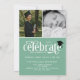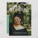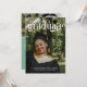 Invitación a la graduación con un graduado con un elegante tipo de letra con una pequeña tapa de graduación en la a. Invitación a graduarse en tipografía moderna personalizada con tres fotos, una grande en un lado y dos más pequeñas en el otro. Invitación doble a graduarse y invitación de graduación impresa con una gran foto del graduado por un lado, y la invitación en blanco y verde marino por el otro lado.