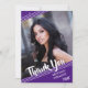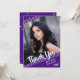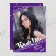 Líneas blancas simples y limpias contra un fondo morado y estrellas mudas con un título de guión de broche GRACIAS Y el año de graduación acentúan el nombre de tu graduado y una de sus fotos. La parte posterior presenta un patrón de estrellas y un lugar para escribir un mensaje genérico de agradecimiento (puede eliminar el texto de ejemplo para dejar en blanco los mensajes personales escritos a mano) en un fondo morado. PUNTO DE FOTO: Para obtener resultados más rápidos/mejores, en la parte delantera, elija una foto con el sujeto en el centro de un rectángulo horizontal para acomodar la posición diagonal. y/o prerecortar en una forma rectangular amplia ANTES de subir y rellenará perfectamente el espacio de la foto. Póngase en contacto con el diseñador si desea modificar este diseño, en otro producto o desea coordinar elementos para su conjunto de fiestas.