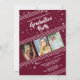 Líneas blancas simples y limpias contra un fondo burdeos/marrón editable y estrellas plateadas descoloridas con un título de guion de broche "Graduado" y el año de graduación acentúan el nombre de tu graduado y cuatro de sus fotos (una diagonal completa en la parte delantera y tres diagonalmente en la parte posterior). La parte posterior presenta el mismo diseño de líneas diagonales, patrón de estrellas desvanecidas, tres fotos y detalles de invitación de tu fiesta de graduación en un fondo editable de color burdeos/marrón que puedes cambiar para coordinar con tus fotos, colores escolares o colores de temas fiestas. PUNTO FOTOGRÁFICO: Para obtener resultados más rápidos/mejores, en la parte delantera, elija una foto con el sujeto en el centro de un rectángulo horizontal para acomodar la posición diagonal. En la parte de atrás, seleccione las fotos con el sujeto en el medio y/o pre-recortarlas en una forma similar como se muestra ANTES de subir y llenarán el espacio de la foto perfectamente. Póngase en contacto con el diseñador si desea modificar este diseño, en otro producto o desea coordinar elementos para su conjunto de fiestas.