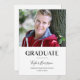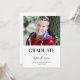 Esta moderna tarjeta de foto para graduación presenta una tipografía simple y una gran foto. Una foto horizontal del graduado está en la parte superior, con la palabra "Graduado" escrita con letras de moda en la capital debajo. Debajo de la tipografía, agregue el nombre del graduado en caligrafía de escritura, con el año escolar y el año de graduación en la parte inferior de la tarjeta. La tipografía es negra en un fondo blanco. La parte posterior de la tarjeta de graduación incluye una plantilla opcional para agregar detalles de la fiesta de graduación.