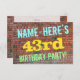 Este divertido diseño de invitación para fiestas de cumpleaños incluye un mensaje como "¡NOMBRE DE LA 43ª FIESTA DE CUMPLEAÑOS!", donde el nombre puede ser personalizado, en la parte delantera. El fondo está representado por una pared de ladrillo de ladrillo marrón rojizo. El texto del mensaje de personalizable en la parte delantera presenta colores como azul, amarillo y verde, y tiene un aspecto inspirado en el de los graffitis pintados. En la parte posterior aparece un mensaje de personalizable que podría incluir detalles relevantes sobre la fiesta de cumpleaños. Las invitaciones a fiestas de cumpleaños como esta pueden ser una manera divertida de invitar a familiares y amigos a una fiesta de cumpleaños que se lleva a cabo para alguien que está celebrando su cuarenta y tres años. [~Z0000287]