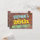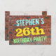 Este divertido diseño de invitaciones para fiestas de cumpleaños incluye un mensaje como "¡LA FIESTA DE CUMPLEAÑOS DE STEPHEN!", donde el nombre puede ser personalizado, en la parte delantera. El fondo está representado por una pared de ladrillo de ladrillo marrón rojizo. El texto del mensaje de personalizable en la parte delantera presenta colores como azul, amarillo y verde, y tiene un aspecto inspirado en el de los graffitis pintados. En la parte posterior aparece un mensaje de personalizable que podría incluir detalles relevantes sobre la fiesta de cumpleaños. Las invitaciones de cumpleaños como esta pueden ser una manera divertida de invitar a familiares y amigos a una fiesta de cumpleaños que se lleva a cabo para alguien que está celebrando su vigésimo sexto cumpleaños. [~Z0000287]