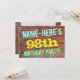 Este divertido diseño de invitación para fiestas de cumpleaños incluye un mensaje como "¡NOMBRE DE LA FIESTA DEL CUMPLEAÑOS DE AQUÍ!", donde el nombre puede ser personalizado, en la parte delantera. El fondo está representado por una pared de ladrillo de ladrillo marrón rojizo. El texto del mensaje de personalizable en la parte delantera presenta colores como azul, amarillo y verde, y tiene un aspecto inspirado en el de los graffitis pintados. En la parte posterior aparece un mensaje de personalizable que podría incluir detalles relevantes sobre la fiesta de cumpleaños. Las invitaciones a fiestas de cumpleaños como esta pueden ser una manera divertida de invitar a familiares y amigos a una fiesta de cumpleaños que se lleva a cabo para alguien que está celebrando su cumpleaños noventa y ocho. [~Z0000287]