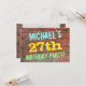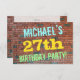 Este divertido diseño de invitación para fiestas de cumpleaños incluye un mensaje como "¡LA FIESTA DEL CUMPLEAÑOS DE MICHAEL!", donde el nombre puede ser personalizado, en la parte delantera. El fondo está representado por una pared de ladrillo de ladrillo marrón rojizo. El texto del mensaje de personalizable en la parte delantera presenta colores como azul, amarillo y verde, y tiene un aspecto inspirado en el de los graffitis pintados. En la parte posterior aparece un mensaje de personalizable que podría incluir detalles relevantes sobre la fiesta de cumpleaños. Las invitaciones a fiestas de cumpleaños como esta pueden ser una manera divertida de invitar a familiares y amigos a una fiesta de cumpleaños que se lleva a cabo para alguien que está celebrando su vigésimo séptimo cumpleaños. [~Z0000287]