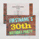 Este divertido diseño de invitaciones para fiestas de cumpleaños incluye un mensaje como "¡FIESTA 30 de cumpleaños de FIRSTNAME!", donde el nombre se puede personalizar, en la parte delantera. El fondo está representado por una pared de ladrillo de ladrillo marrón rojizo. El texto del mensaje de personalizable en la parte delantera presenta colores como azul, amarillo y verde, y tiene un aspecto inspirado en el de los graffitis pintados. En la parte posterior aparece un mensaje de personalizable que podría incluir detalles relevantes sobre la fiesta de cumpleaños. Las invitaciones a fiestas de cumpleaños como esta pueden ser una manera divertida de invitar a familiares y amigos a una fiesta de cumpleaños que se lleva a cabo para alguien que está celebrando su trigésimo cumpleaños. [~Z0000287]