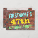 Este divertido diseño de invitación para fiestas de cumpleaños incluye un mensaje como "¡FIESTA DE CUMPLEAÑOS DE FIRSTNAME!", donde el nombre se puede personalizar, en la parte delantera. El fondo está representado por una pared de ladrillo de ladrillo marrón rojizo. El texto del mensaje de personalizable en la parte delantera presenta colores como azul, amarillo y verde, y tiene un aspecto inspirado en el de los graffitis pintados. En la parte posterior aparece un mensaje de personalizable que podría incluir detalles relevantes sobre la fiesta de cumpleaños. Las invitaciones de cumpleaños como esta pueden ser una manera divertida de invitar a familiares y amigos a una fiesta de cumpleaños que se lleva a cabo para alguien que está celebrando su cumpleaños número cuarenta y siete. [~Z0000287]