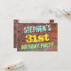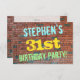 Este divertido diseño de invitaciones para fiestas de cumpleaños incluye un mensaje como "¡LA FIESTA DEL CUMPLEAÑOS 31 DE STEPHEN!", donde el nombre puede ser personalizado, en la parte delantera. El fondo está representado por una pared de ladrillo de ladrillo marrón rojizo. El texto del mensaje de personalizable en la parte delantera presenta colores como azul, amarillo y verde, y tiene un aspecto inspirado en el de los graffitis pintados. En la parte posterior aparece un mensaje de personalizable que podría incluir detalles relevantes sobre la fiesta de cumpleaños. Las invitaciones a fiestas de cumpleaños como esta pueden ser una manera divertida de invitar a familiares y amigos a una fiesta de cumpleaños que se lleva a cabo para alguien que está celebrando su cumpleaños número treinta. [~Z0000287]